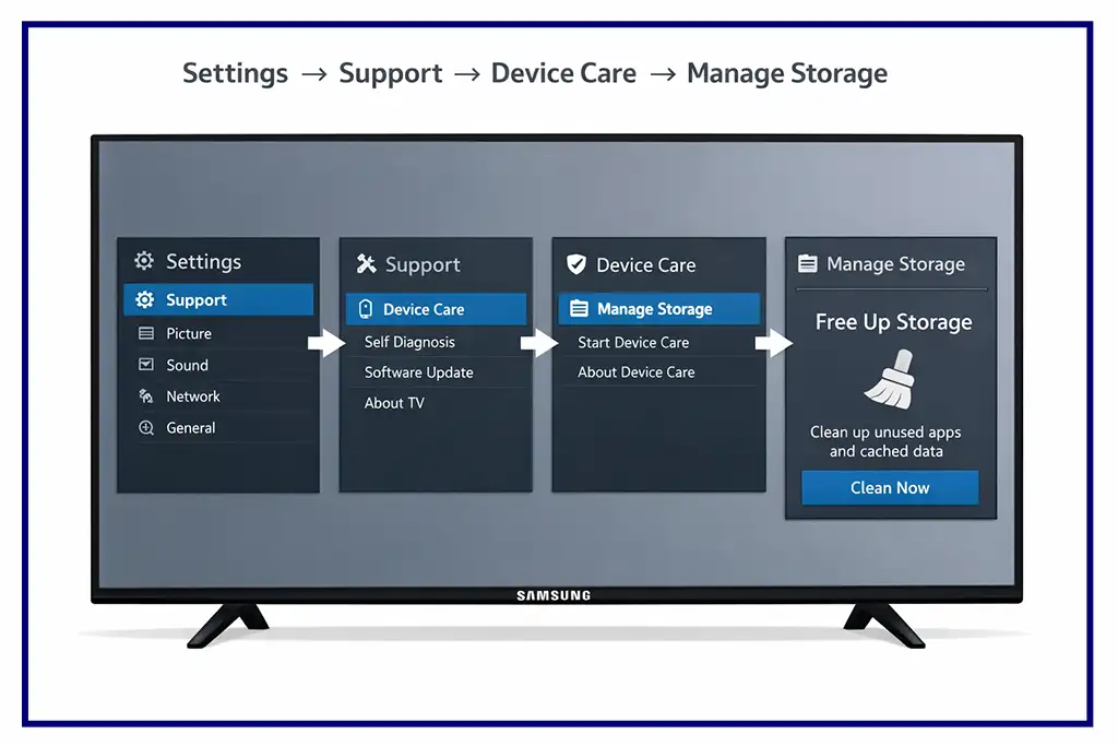 Pour vérifier la quantité de mémoire utilisée, ouvrez Apps sur le téléviseur et accédez à Settings (l’icône en forme d’engrenage dans le coin supérieur droit). Cette section affiche généralement la quantité de mémoire utilisée par les applications. Sur certains modèles, les informations de mémoire sont également disponibles dans Settings → Support → Device Care → Manage Storage, où le téléviseur indique la mémoire utilisée et la mémoire disponible.