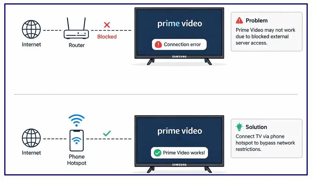 Si l’application Amazon Prime Video ne fonctionne pas sur votre Samsung Smart TV, c’est un problème assez courant. Il se manifeste généralement lorsque l’application ne s’ouvre pas ou ne se charge pas correctement. Lorsque vous la lancez, l’icône Prime Video peut apparaître, mais l’écran devient ensuite noir, ou le téléviseur peut se bloquer pendant que l’application tente de se charger à plusieurs reprises sans succès.