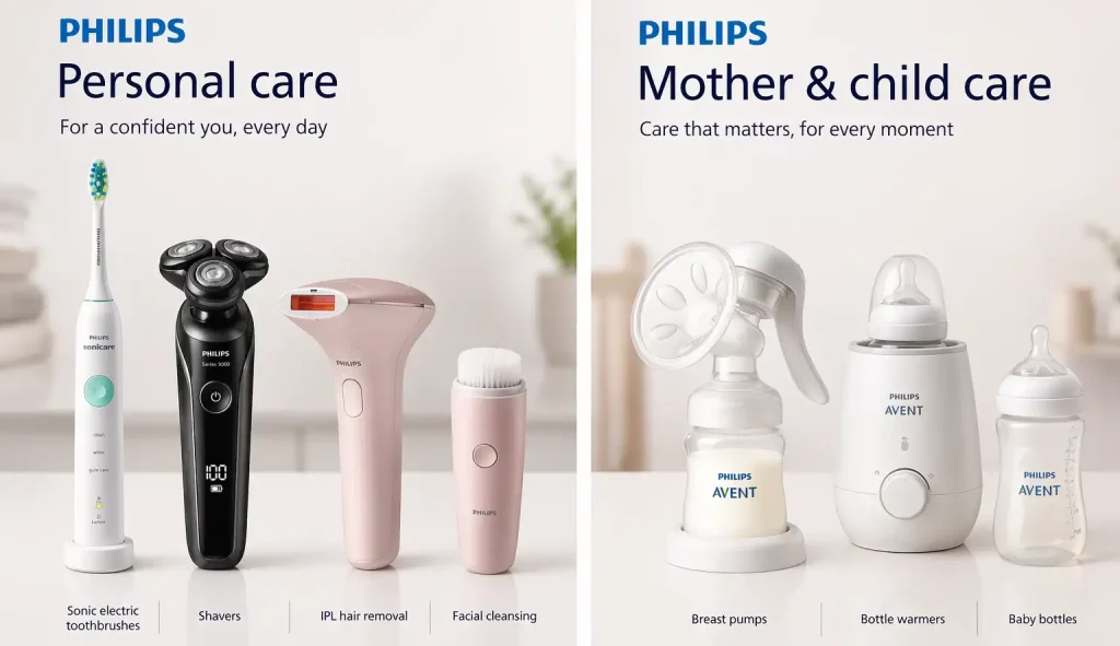 Aujourd’hui, Royal Philips conserve le contrôle du développement des produits de soins personnels ainsi que des dispositifs destinés aux mères et aux bébés. Cependant, ces produits ne sont pas fabriqués directement par Philips, ils sont conçus par l’entreprise puis produits par des partenaires OEM.