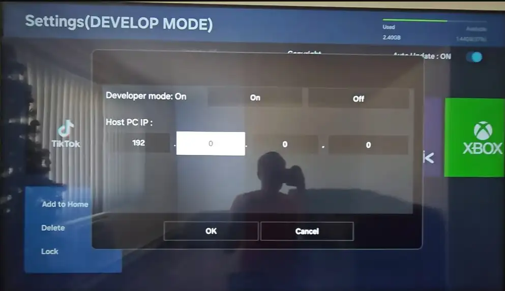 Pour activer le mode développeur, procédez comme suit. Ouvrez la section « Applications » sur votre téléviseur et accédez à l’écran de la boutique d’applications. Entrez dans les paramètres. Lorsque le champ de saisie numérique apparaît, saisissez sur la télécommande la séquence 1, 2, 3, 4, 5. Le menu Developer Mode s’ouvrira alors.