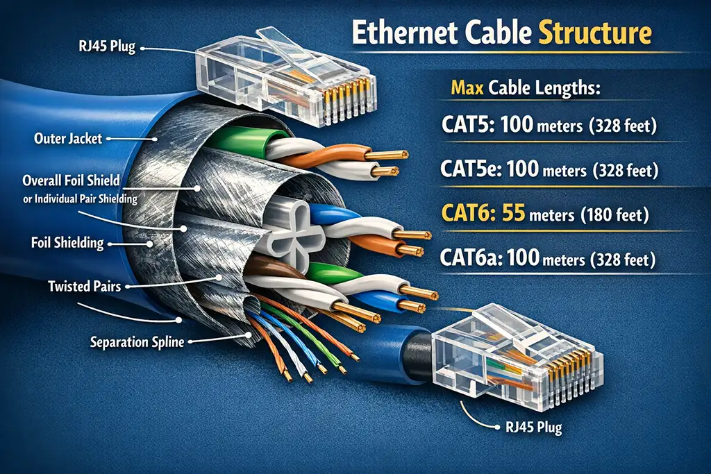 La longueur maximale des câbles CAT5 et CAT5e est de 100 mètres (328 pieds). Pour les câbles CAT6, la longueur maximale est de 55 mètres (180 pieds) lorsqu’ils fonctionnent à 10 Gbps, tandis qu’à 1 Gbps, elle peut atteindre 100 mètres. Les câbles CAT6a prennent en charge 10 Gbps sur une distance de 100 mètres (328 pieds). Selon la qualité du câble, ces câbles peuvent également fonctionner sur des distances plus longues, mais les valeurs indiquées représentent les spécifications de base.