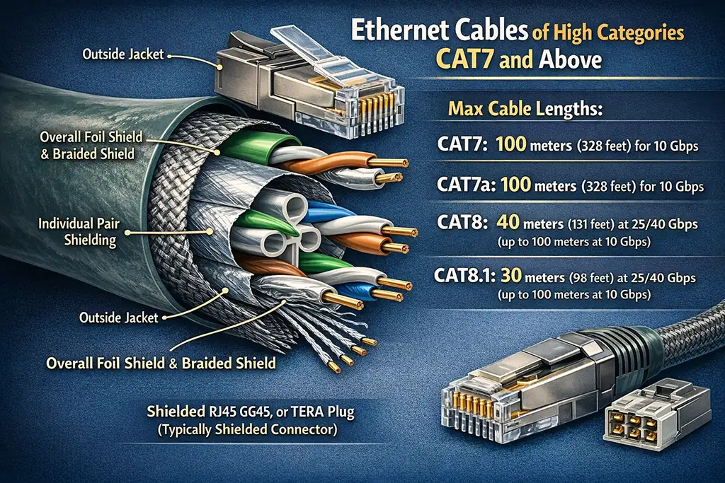 Longueur maximale prise en charge par le câble. Les câbles CAT7 et CAT7a prennent en charge des débits de transfert de données allant jusqu’à 10 Gbit/s sur une distance Ethernet standard de 100 mètres. Les câbles CAT8 sont principalement conçus pour les centres de données et prennent en charge des débits de 25 ou 40 Gbit/s sur des distances plus courtes, généralement jusqu’à 30-40 mètres, tout en conservant la capacité de transmettre des données à 10 Gbit/s sur des distances plus longues.