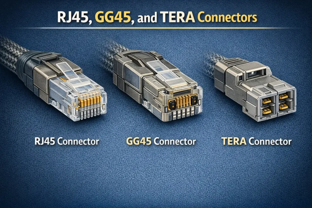 Des connecteurs blindés doivent être utilisés avec les câbles de cette catégorie. Selon la norme et l’application, il peut s’agir d’un connecteur RJ45, GG45 ou TERA blindé. À ces fréquences, la continuité du blindage entre le câble et le connecteur est très importante, c’est pourquoi il ne faut pas utiliser de connecteurs non blindés.