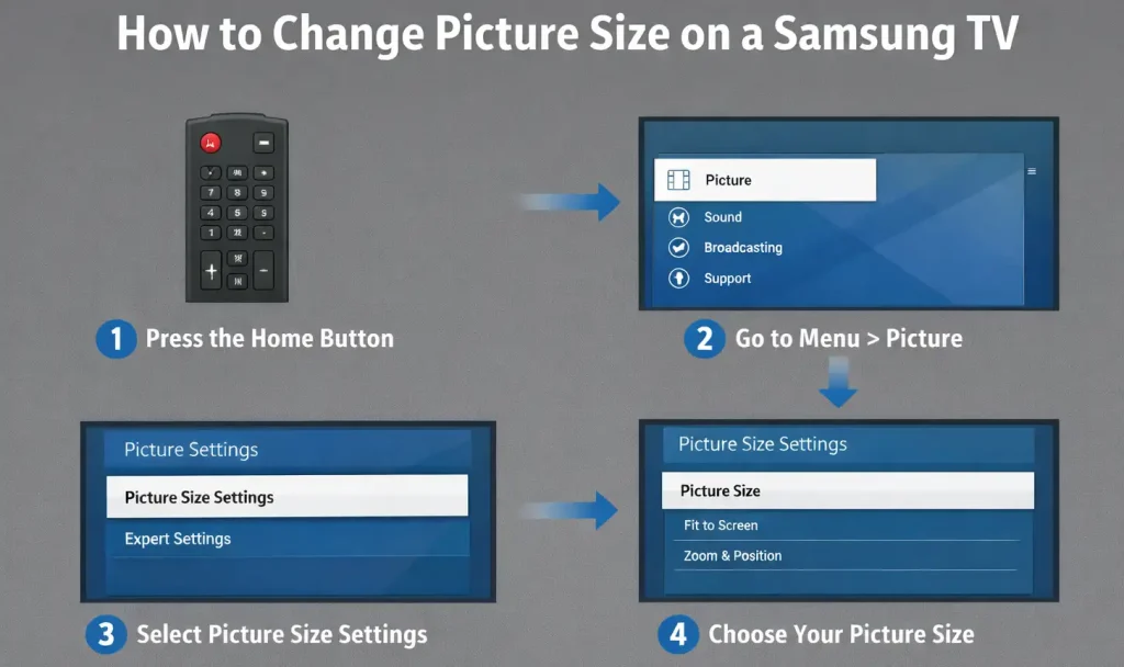 Pour modifier la taille de l’image sur une TV Samsung, appuyez sur le bouton « Home » de la télécommande, puis allez dans « Menu ». Ouvrez « Paramètres » et sélectionnez « Image ». Ensuite, choisissez « Paramètres de taille de l’image », ouvrez « Taille de l’image » et sélectionnez l’option qui convient le mieux à votre écran.