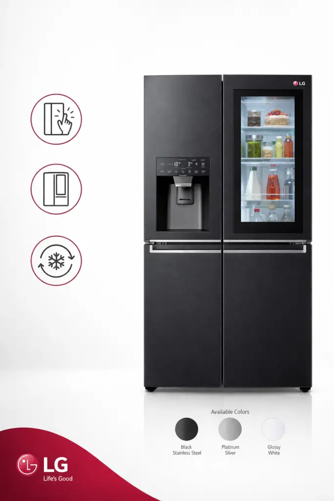 L’étape suivante a été le développement de l’InstaView Door-in-Door, une solution plus avancée et moderne. Au lieu d’ouvrir le panneau extérieur, il suffit de taper deux fois sur le verre. Cela active l’éclairage intégré et rend le verre transparent, permettant de voir le contenu sans ouvrir la porte. Cette fonction réduit encore davantage la perte d’air froid et donne au réfrigérateur un aspect moderne et technologique.
