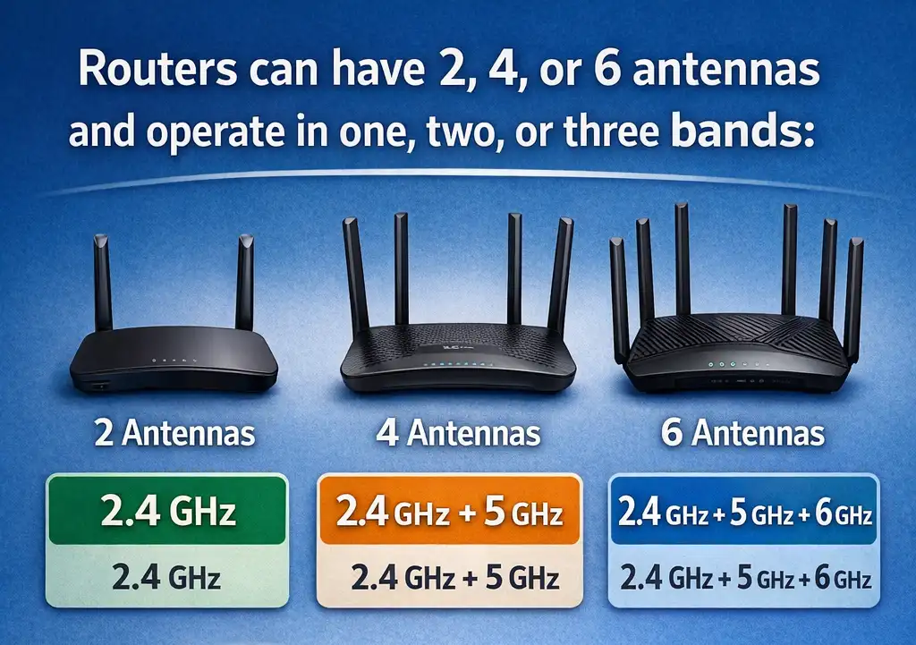 Aujourd’hui, les routeurs peuvent être équipés de deux, quatre ou six antennes et fonctionner sur une seule bande (2,4 GHz), sur deux bandes (2,4 GHz et 5 GHz) ou sur trois bandes (2,4 GHz, 5 GHz et 6 GHz). C’est pourquoi il est préférable de se concentrer sur les spécifications techniques détaillées plutôt que sur des termes marketing accrocheurs.