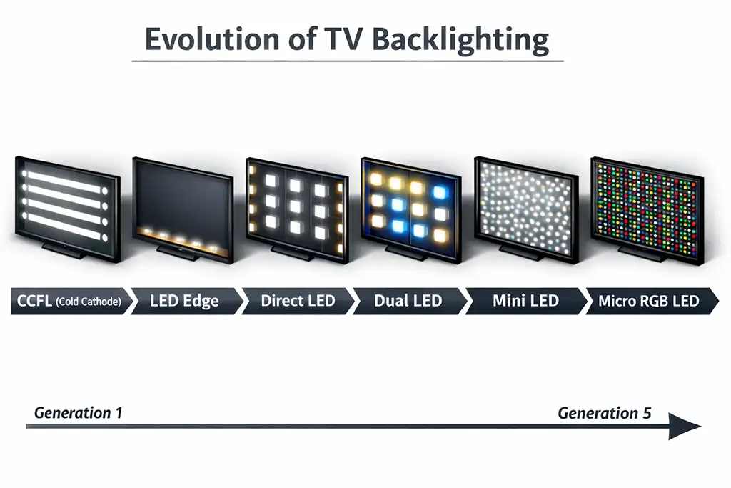 Le rétroéclairage Micro LED est le résultat de l’évolution continue des technologies de rétroéclairage des téléviseurs et peut être considéré comme la cinquième étape de ce développement. La première génération utilisait des lampes fluorescentes à cathode froide (CCFL). Elle a ensuite été suivie par le rétroéclairage LED Edge, puis par le Direct LED. Plus tard, les systèmes Dual LED sont apparus, ajoutant une LED bleue au rétroéclairage. La technologie Mini LED est venue ensuite, remplaçant les LED de grande taille par des LED plus petites afin d’augmenter le nombre de sources lumineuses et d’améliorer le contrôle de la luminosité. Le rétroéclairage Micro LED constitue l’étape suivante et utilise trois LED distinctes : rouge, verte et bleue.